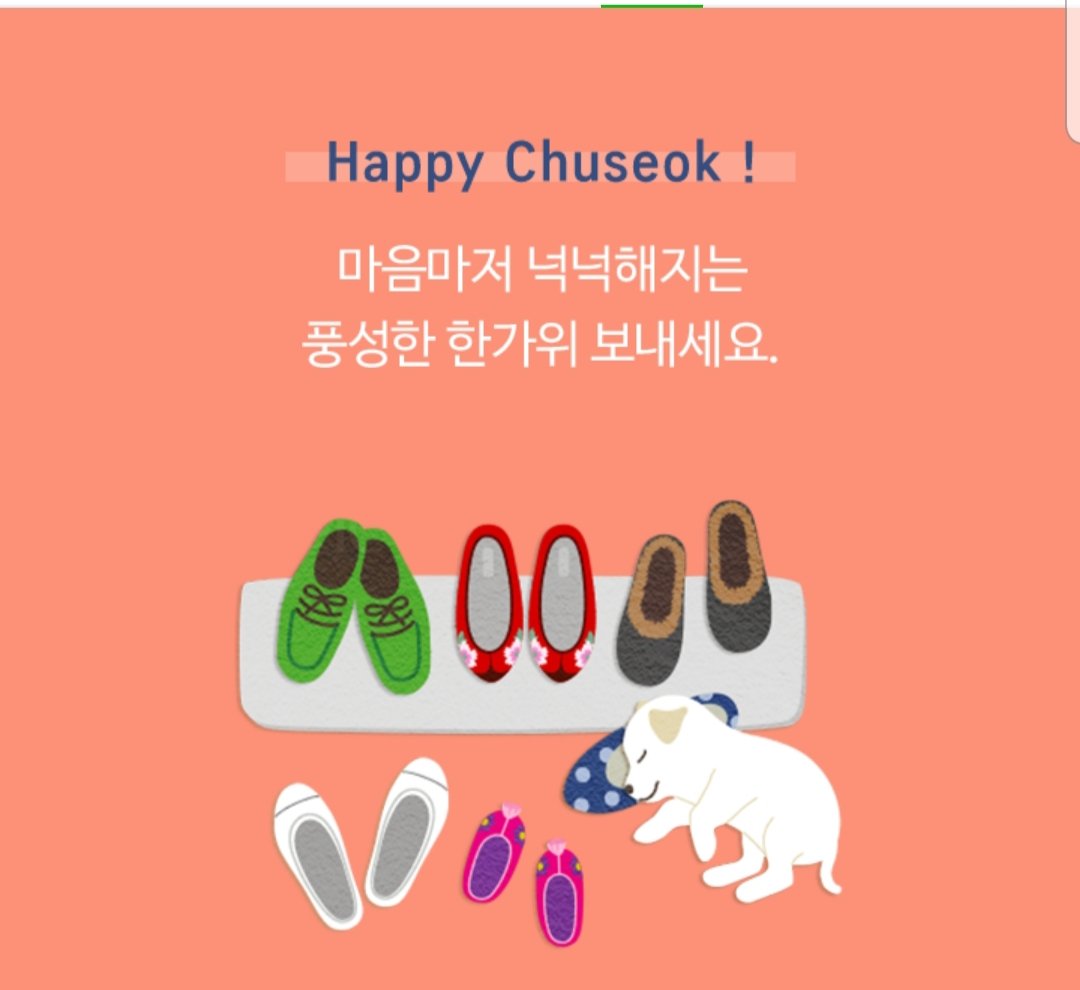 힘들었던 여름을 뒤로하고 즐겁고 편한 한가위 보내시길 바라겠습니다. 바쁜 업무를 잠시 내려두고 가족과 즐거운 시간을 보내시길 바라며 건강하게 다시 뵙겠습니다. 귀사의 가정에 늘 한가위의 즐거움과 풍요로움이 함꼐 하시기를 바래요.