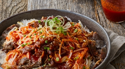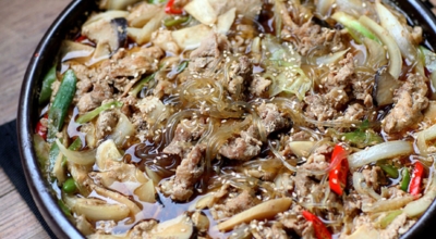 사리로 넣을 당면은 미리 물에 불려두면 빠르게 조리할 수 있다고 하죠. 미처 불리지 못했다면 뜨거운 물에 살짝 데쳐서 넣어주면 좋아요. 고기가 살짝 익어갈 때쯤 당면도 같이 넣어 익혀주어요. 당면이 들어가면 국물을 흡수하니 국물이 졸아들어 타지 않도록 잘 살펴보아야 하고, 바닥에 달라붙기도 하니 한 번씩 저어가며 익혀주세요. 보글보글 끓어서 고기도 다 익고, 당면도 제대로 잘 익었으면 불을 꺼 주세요. 불고기 양념 황금레시피로 만든 소불고기 완성입니다.