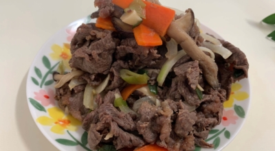 이제 볶기만 하면 돼요. 프라이팬을 달궈준 후 양념된 소고기를 넣어줘요. 야채를 넣어줘요. 양파와 그리고 당근, 표고버섯을 넣어줍니다. 처음에 센 불로 빠르게 볶다가 중불로 고기가 익을 때까지 골고루 볶아주어요. 소고기라서 그리 장기간 익히지 않아도 됩니다. 붉은 고기가 회색의 빛깔로 되도록 잘 볶아줍니다. 양념이 다 되었기에 볶아주기만 하면 소 불고기가 완성되었습니다.