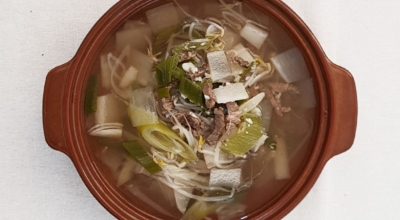 양지 160g, 무 300g, 파뿌리, 간장(1), 멸치젓(1), 다진 마늘(0.8-1) 소금, 후추가루, 참기름(1), 포도씨유(1), 물 1.4리터