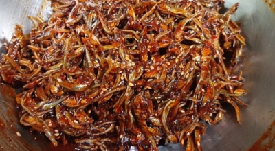 멸치를 활용하기 전에 물에 담가 소금을 약간 넣고 30분 정도 불려줘요. 그리고 불려진 멸치를 깨끗이 헹군 후 물기를 제거해요. 마늘은 껍데기을 벗겨 잘게 다지거나 다진 마늘을 준비해요. 먼저 중간 불에서 팬에 식용유를 두르고 다진 마늘을 볶아 향을 낸 후 멸치를 넣고 볶습니다. 멸치가 색이 변하고 향이 퍼지면 고추장과 설탕을 넣고 중간 불에서 볶아주어요.