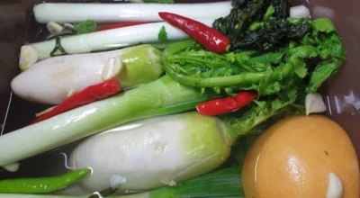 물기 남은 동치미용 무를 꽃소금에 굴립니다. 동치미용 무를 12시간 동안 절입니다. 절여서 나온 물을 동치미 국물에 사용합니다. 절대 버리지 마세요 동치미 맛 살리는 채소 3가지가 들어가요. 이 채소들도 절여줘야 됩니다. 마찬가지로 물 없이 소금만으로 절여주세요. 실파, 갓, 무청 고갱이 각 200g에 꽃소금 3큰술을 흩뿌려주어요. 실파, 갓, 무청 고갱이를 30분간 절입니다.