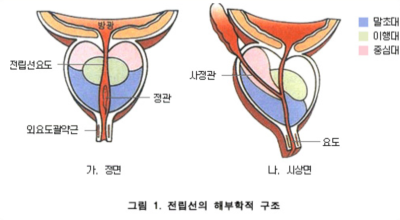 전립샘이라고도 합니다. 전립선은 소변과 정액의 통로 역할을 하는 요도관을 둘러싸고 있습니다. 위는 둥글고 밑으로 내려 갈수록 좁아지다가 맨끝은 뭉툭합니다. 가장 넓은 부위의 지름은 4㎝ 정도입니다. 정낭이 분비하는 액체와 정자를 운반하는 2개의 사정관은 전립선의 중앙에서 모여 좁아지고 요도와 합쳐집니다. 전립선은 액체를 요도와 사 정관으로 분비하는 30~50개의 관 형태의 샘들이 모인 집합체입니다.