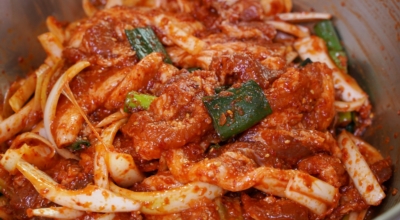양념 : 고추장 4숟가락, 고추가루 5숟가락, 설탕 2숟가락, 물엿 1숟가락, 진간장 2숟가락, 다진마늘 1숟가락, 다진생강 0.3숟가락, 참기름 1숟가락, 통깨 1숟가락, 후추 약간