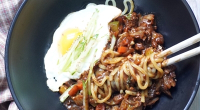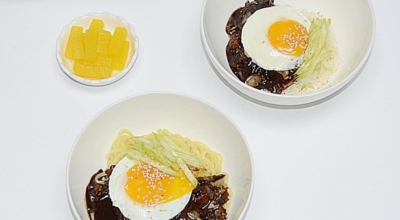 재료-양파 1~2개양배추 1/5통애호박 1/4개돼지고기 다짐육 200g춘장 125g간장 1큰술설탕 2 큰술물 550ml중화면 3인분전분 물(전분 2 큰술, 물 3큰술)계란 3개