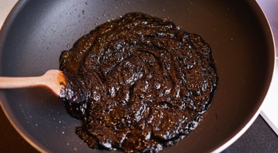 돼지고기가 적당히 익으면 간 생강을 넣어줘요. 팬 한쪽에 진간장, 굴 소스를 넣고 눌어지도록 볶아주고, 설탕을 넣어줍니다. 춘장을 넣고 중불로 바닥이 눋지 않도록 계속 저어주고 튀겨 완성해요. 깊은 맛을 원한다면 개인 취향에 맞게 MSG를 넣어줍니다. 밀폐용기에 담아 식혀서 냉장 보관해요.
