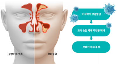 그 부위를 눌렀을 때 심한 통증을 호소하는 경우 급성 세균성 부비동염으로 바이러스성 부비동염은 합병증이 없을 경우 완전 자연 치유되지만 세균성 부비동염은 적절한 치료를 받지 못할 때에는 위험한 합병증이나, 만성 부비동염으로 진행할 수 있으므로 콧물, 코막힘이 2주 이상 나타난다면 바로 병원에 내원해서 치료를 받으셔야 합니다.