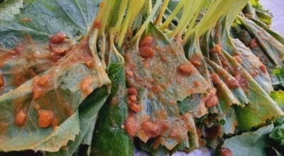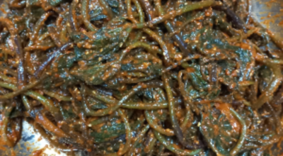재료 : 머위 (데친 무게) 3,3kg, 양파 한 개, 만능 맛간장 2컵, 멸치 액젓 1컵, 고춧가루 2컵, 다진 마늘 1/2컵, 물엿 1컵, 통깨 1컵, 뉴슈가 1 작은 술, 밀가루 풀(밀가루 1/2컵, 물 1컵, 다시마 멸치육수 2컵)