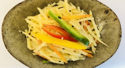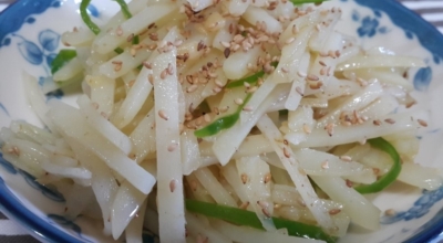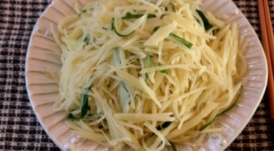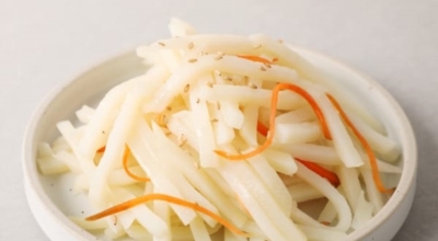 감자는 점질감자와 분질감자로 구분돼요. 이 두가지를 힙친 감자가 바로 '수미감자' 입니다. 이보은 선생님은 감자볶음을 할 '수미감자'를 활용하여니다. 감자는 껍질을 벗겨 나무젓가락 얇은 쪽처럼 곱게 채를 썰어줘요. 찬물에 채 썬 감자를 담가 비벼 가면서 씻어 전분을 없앤합니다. 전분을 제거해야 감자가 후라이팬에 들러붙지 않아요. 물기를 제거하고 넓찍한 볼에 담는다. 소금과 국간장을 넣고 버무린 후 10분 절입니다.
