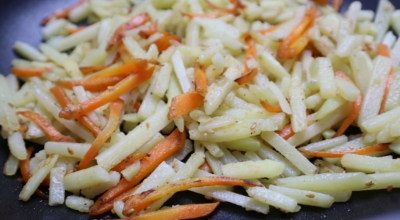 당근과 양파를 1분간 먼저 볶아준 뒤 감자를 넣고 2분간 추가로 볶아줍니다. 2분간 볶아준 감자는 들기름 2스푼을 두르고 다진마늘과 볶은소금을 넣어 간을 맞춰주세요. 굳이 다른 양념을 넣지 않아도 마늘과 소금으로 간을 하면 깔끔하니 맛있답니다. 간을 맞춰준 뒤 추가로 1분간 더 볶아주세요.