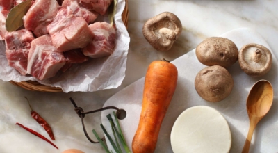 돼지갈비는 뼈와 동반해 구입한 후 찬물에 30분 정도 담가 핏물을 제거해줘요. 손질한 돼지갈비는 찬물에 씻어서 물기를 제거해줘요. 마늘은 껍질을 제거하고, 대파와 양파는 껍질을 벗긴 후 각각 2~3등분으로 썰어주어요. 생강은 껍질을 벗은 후 얇게 슬라이스 해줘요. 이렇게 손질한 돼지갈비와 야채들을 뚝배기에 넣어주기 전에, 한번 더 물에 씻어서 불순물을 제거해줍니다.